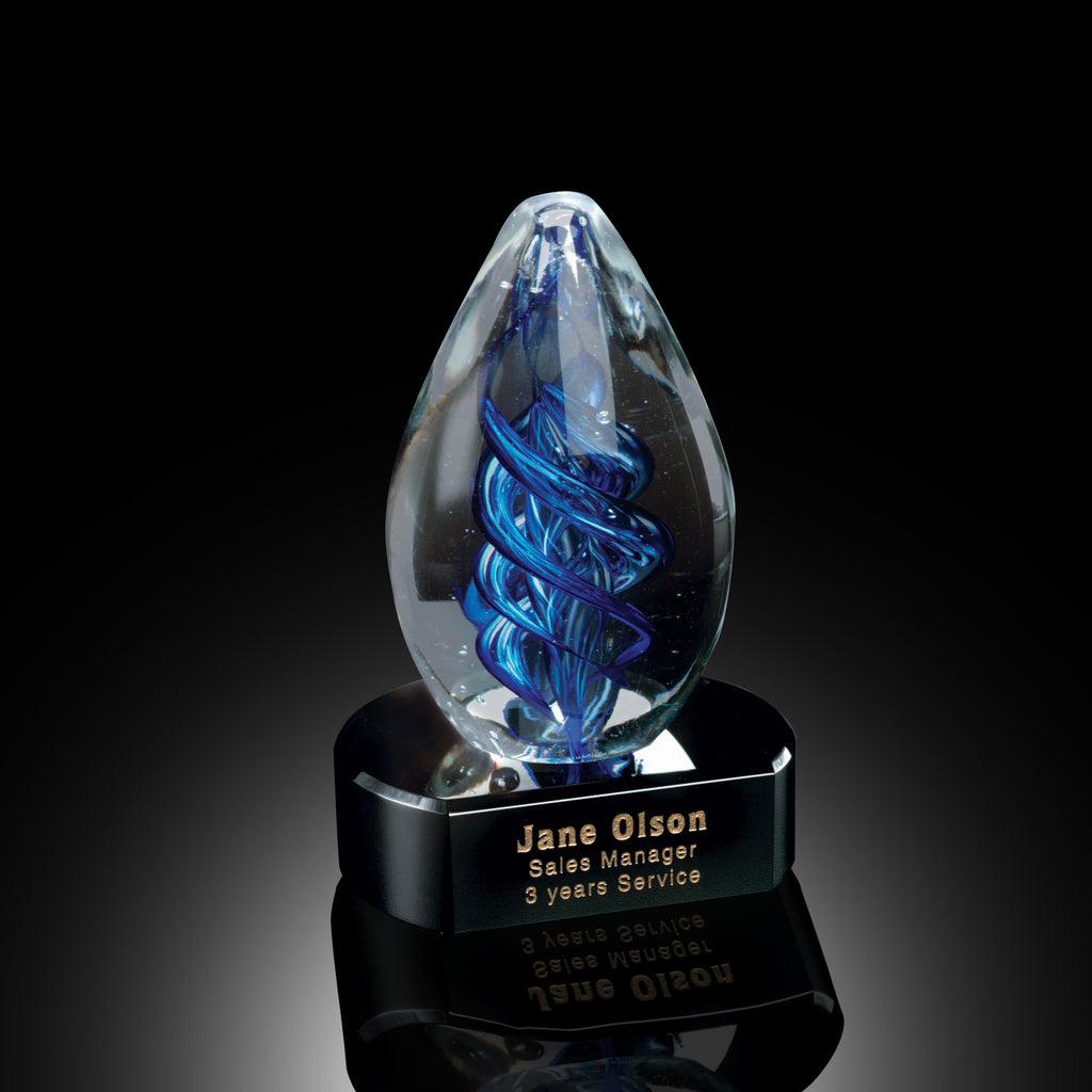 Description: The Blue Swirl on Black Base award features a clear glass teardrop enhanced by an interlacing cobalt-blue swirl in its center. For employees and coworkers of vision, this custom-engraved glass award expresses appreciation through originality and striking beauty. With free engraving and quantity discount pricing, you'll find the Blue Swirl award is an affordable selection for your employee appreciation programs.