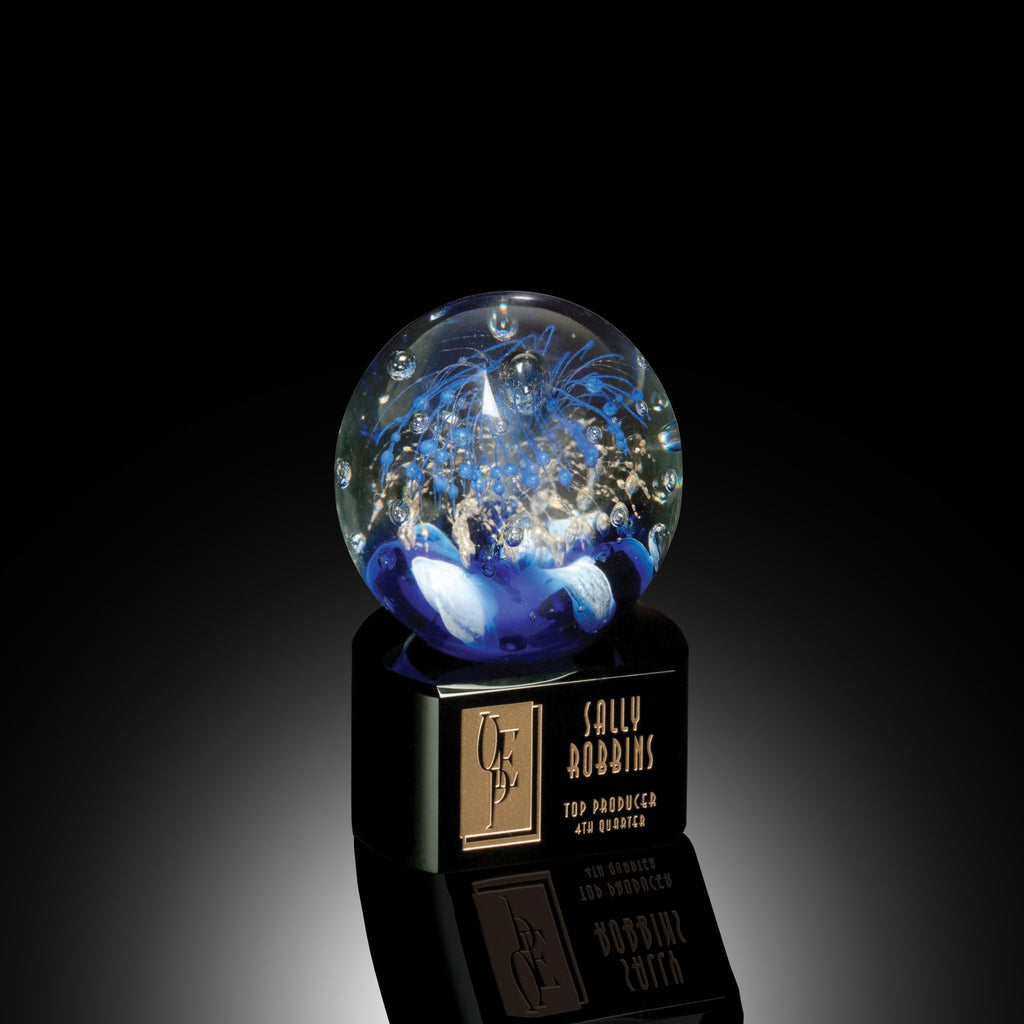 Description: The Celebration on Black Base clearly expresses appreciation to your top performing employees where other traditional awards fall short! An explosion of light blue and gold fireworks cascade over a sea of ornate white and blue glass to honor high achievers. Weighing over 5 pounds, this substantial art glass award includes a base of black crystal to engrave a message of appreciation or commemorate an employee milestone.