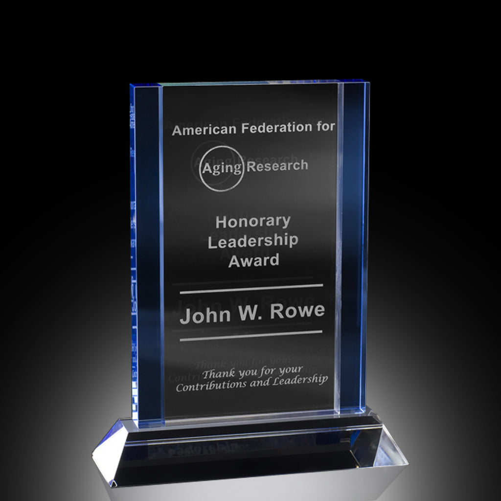The Carpinteria Crystal Award features an optic crystal rectangle with a blue crystal side accents and is mounted on a clear crystal base. This award is available in 2 sizes and both have a generous amount of room for engraving.