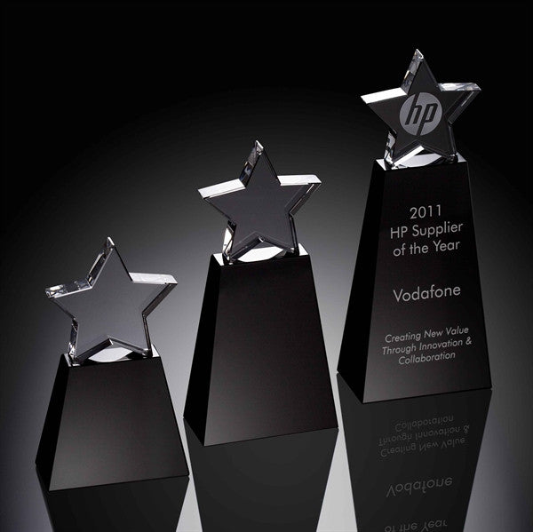 The Clear Star on Black Base Award is the ideal recognition gift for star quality coworkers standing at the top of achievement. Available in three sizes, a large tapered base supports a clear crystal star and delivers a message of "job well done." Deep crystal etching in the crystal star adds frosted appeal while a luxurious silver fill in the black crystal base adds prestige to engraved text and logos.