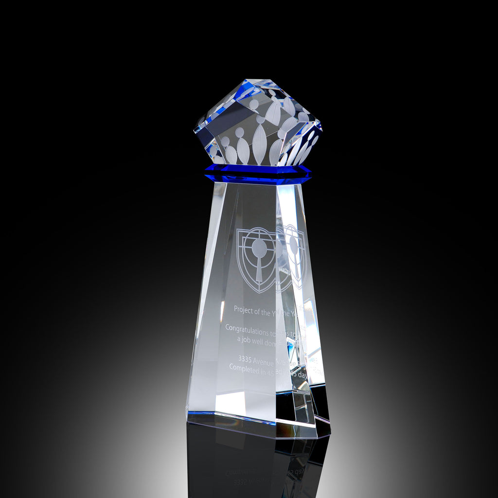 Description:  Wearing a crown of achievement, this crystal award celebrates influential individuals who lead with conviction and strength. The Crown Achievement Elite Crystal Award features a pillar of polished crystal with accents of blue crystal around the crown rim. Present recipients with the "king" of custom engraved crystal awards and your recipients will feel like royalty.