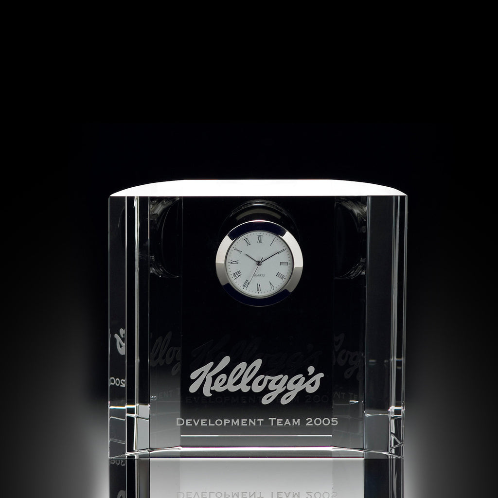 Prestigious sophistication makes this clock worthy of chief executive distinction! Triple bevels on each side of the solid crystal block compliment a Quartz-precision, metal framed clock that commands center stage. Take the time to recognize distinguished award recipients by commemorating noteworthy achievements and milestones in their career.