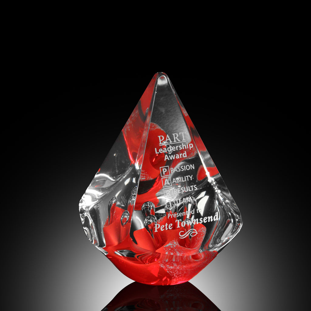 Description: A contemporary pyramid-style glass award with a ribbon of fire-brick red color is a employee recognition gift any deserving recipient would love to display. The Red Quatro is an attractive addition to any award winner's desktop and has a smooth surface to deep glass etch logos, artwork, and text. Give your most creative employees a custom-engraved recognition award with artistic attitude!
