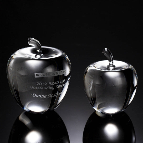 Share: Share on Twitter Share on Facebook View larger ×Close Smooth Apple Crystal Award Read Reviews Small / 1 - $ 80.00 USD Large / 1 - $ 92.00 USD Small / 1 - $ 80.00 USD Small / 24 - $ 76.00 USD Small / 48 - $ 72.00 USD Small / 96 - $ 68.00 USD Large / 1 - $ 92.00 USD Large / 24 - $ 88.00 USD Large / 48 - $ 84.00 USD Large / 96 - $ 80.00 USD $ 68.00 Submit Artwork Now Text Image You may specify engraving text and a logo alongside your order. You can also submit artwork later if you prefer. Add to Cart Pricing Specs Description Size Item # 1+ 24+ 48+ 96+ Small 52022 $ 80.00 $ 76.00 $ 72.00 $ 68.00 Large 52023 $ 92.00 $ 88.00 $ 84.00 $ 80.00 Size / Item # Weight Dimensions Engraving Area Small / 52022 1.4 lb 4"H,3"W,3"D 2"H x 2"W Large / 52023 2.2 lb 4.5"H,3.5"W,3.5"D 2.5"H x 2.5"W Description: This smooth Apple Crystal Award doesn't belong to any sleeping beauties! Our prestigious teacher award recognizes educators and staff who go above and beyond expectations to give their students the educational tools to succeed. An engraving area provides ample room to deep etch a message to outstanding educators in the classroom. Material: Optical CrystalEngraving Method: Deep Crystal EtchingPackaging: Blue Presentation BoxView our other crystal and glass paperweights. Once your order is placed and the artwork is submitted, proofs will be provided for approval prior to production. You can also respond to the order confirmation email with the artwork when ready. ×Close