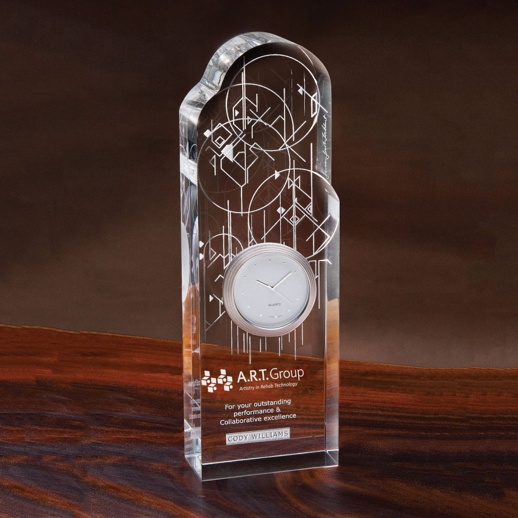 In the Spirit of Frank Lloyd Wright, What is the nature of clockness? Something that is constant, that we cannot hold onto, like a heartbeat, when we are joyful it disappears, when we are sad it barely moves. Our ancestors used star clocks, our wrists carry nano-seconds, we measure our lives by time, uplifting thoughts arrive in a flash of time. Clockness is all about movement - the working of time seems calmly predictable, but may be explosive, chaotic, expanding in space, only relative, not just earth time. For aesthetics, logos and award inscriptions are placed only as shown.