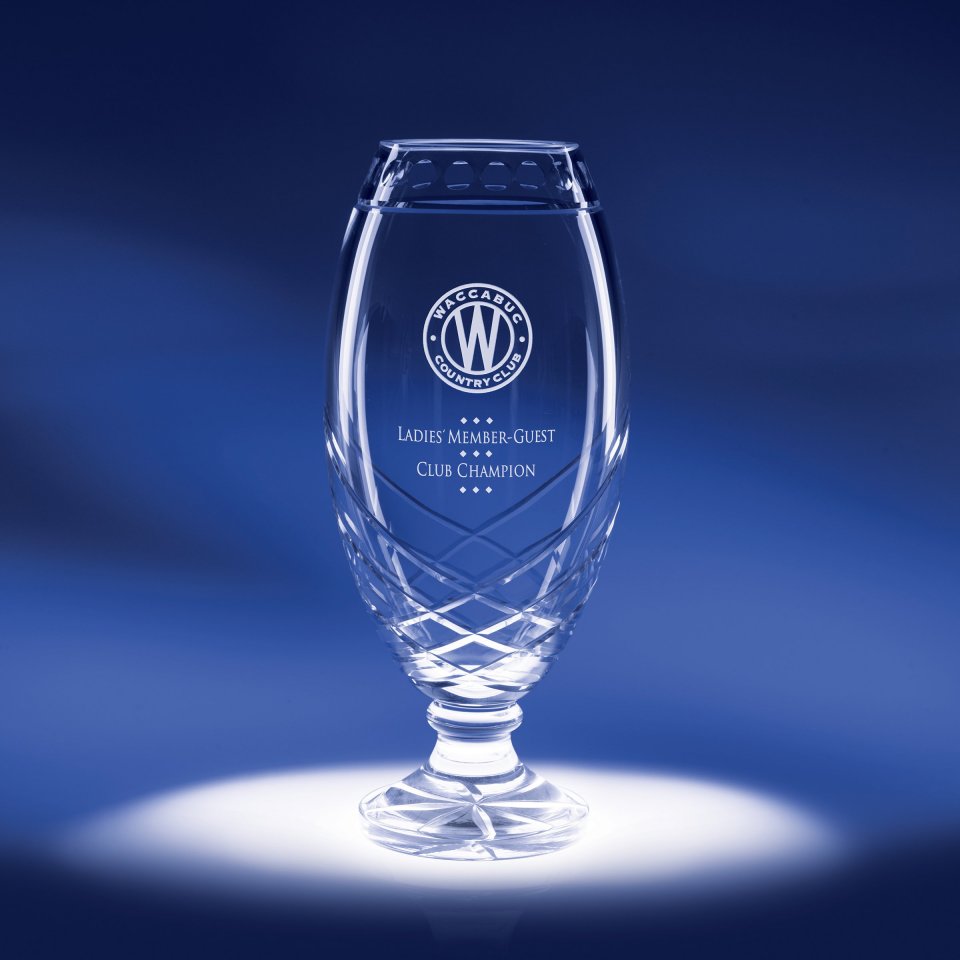 Description: It doesn’t get much prettier than this. Hand-blown, hand cut and polished, the cut pattern on this piece is designed to highlight your logo and message.