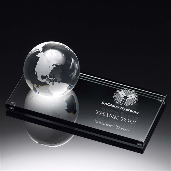 One of our most popular globe awards, the World of Thanks Award expresses gratitude to influential individuals and organizations with global appeal. This prestigious award includes a 3 1/8" diam. crystal globe adhered to a prominent smoked glass base and makes a beautiful presentation. Engraving is provided at no extra charge to make this an economical selection in personalized achievement awards.