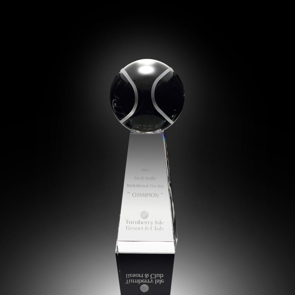 The Crystal Tennis Series Award is the crystal team recognition award worthy of "Grand Slam" status. A solid crystal tennis ball is adhered to the top of a smooth-beveled crystal column. With a generous engraving area on the base, you can reward outstanding athletic performance with personalized logos and text to commemorate the event. Available in three sizes, this economical athletic award will accommodate most trophy recognition budgets. Engraving is included at no additional cost.