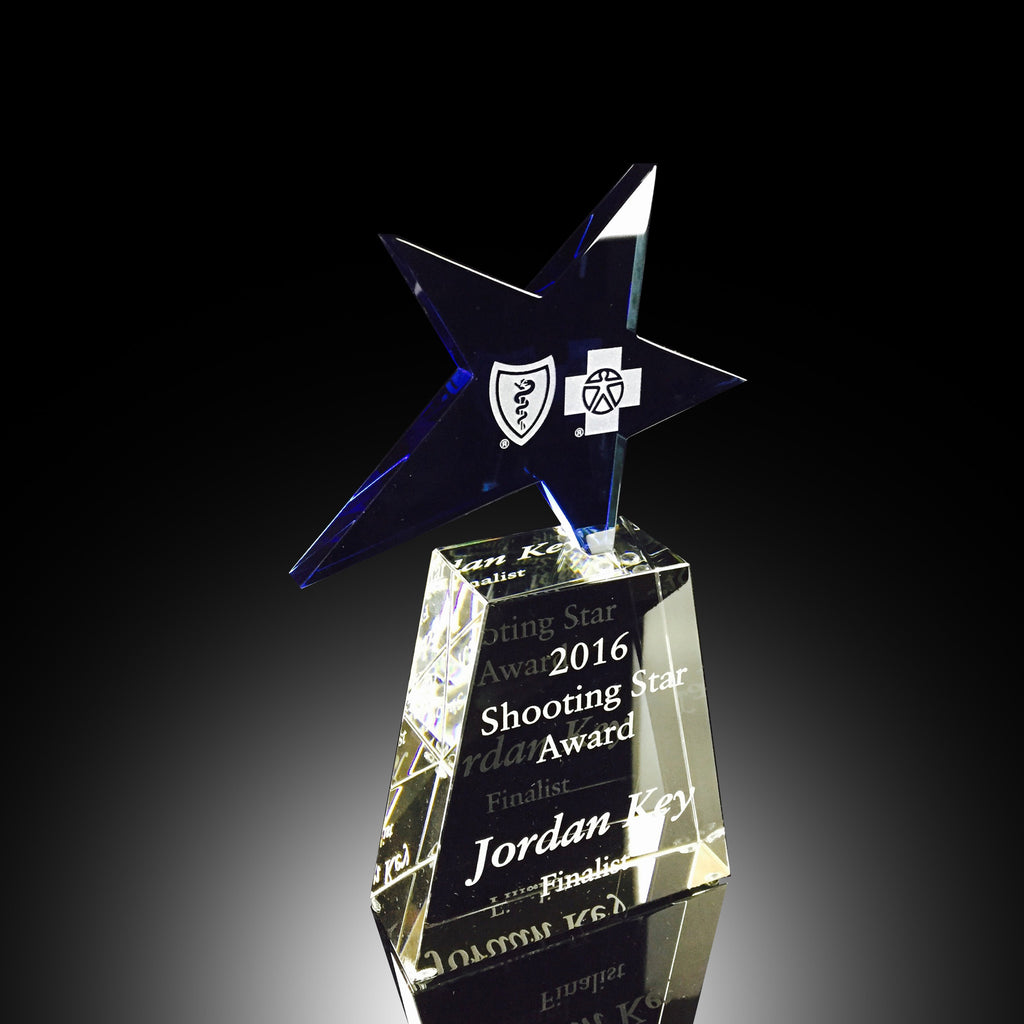 Much like the Clear Falling Star Award, this Blue Falling Star Award features a blue star on a trapezoid base of polished optical crystal. You are able to honor that star employee by engraving your logo in the center of the star and recognizing them with their achievements on the clear crystal base.  This is sure to motivate others to shoot for success.