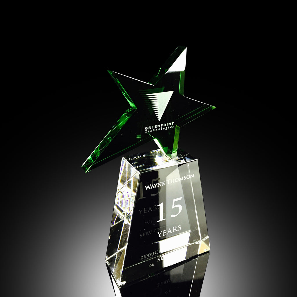 Much like the Clear Falling Star Award, this Green Falling Star Award features a green star on a trapezoid base of polished optical crystal. You are able to honor that star employee by engraving your logo in the center of the star and recognizing them with their achievements on the clear crystal base.  This is sure to motivate others to shoot for success.