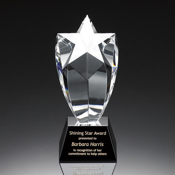 Description: This is one of our most eloquently designed crystal star awards ever! Inspiring individuals to shoot for the stars, the polished optical crystal star shines against a base of black crystal with gold filled engraving. The Shining Star Award with Black Base is sure to make a stunning presence when it takes a prominent position on a coworker or educator's desk.