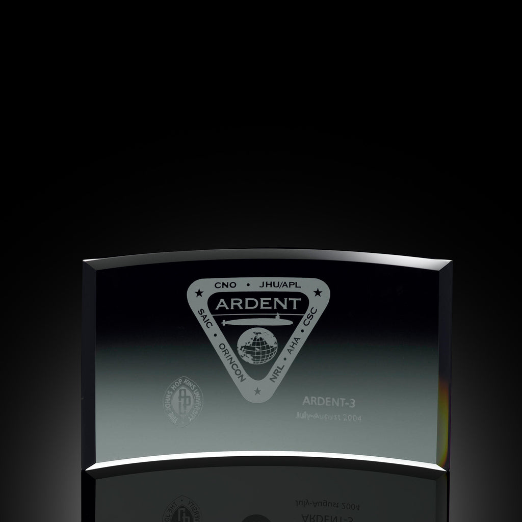 This free-standing, beveled award highlights an etched message of appreciation on smoked black glass. With three generous size selections ranging from 9" to 13" wide, this personalized glass award features an impressive engraving area for logos, custom artwork, and message of exceptional excellence. Reward your most talented coworkers and volunteers in distinctive fashion.
