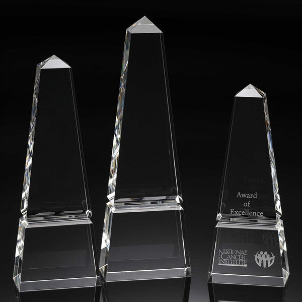 This crystal award earns "Presidential" status. A wider version of our Washington Crystal Tower, the Washington Grooved Crystal Tower award is sectioned and shaped like the Washington Monument. The large beveled groove around the customized crystal award provides two segments to engrave a message and logo design. Honor individual and team achievements of monumental proportion by presenting this corporate award at your next recognition ceremony.